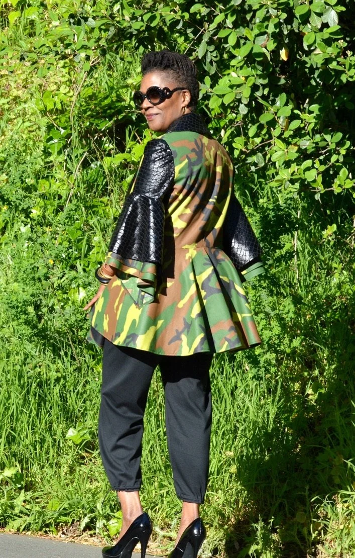 Davis is influenced by individual pieces as opposed to a whole collection. She goes on to describe her favorite ensemble that she created. Inspired by an all-black, monochromatic outfit she had seen in a magazine, Venita created a tunic top with an asymmetrical cut to pair with mid-length, wrap-around waist pants. It is a creation that she wears often as she can accessorize and change it into something different depending on the occasion. She describes herself as a big scarf person. Constructing patterns herself, adding and curating a colorful scarf adds a pop to a look that may not have been there otherwise.